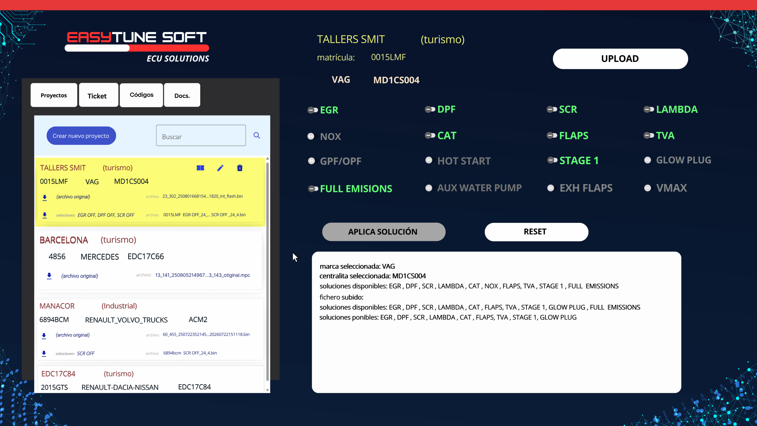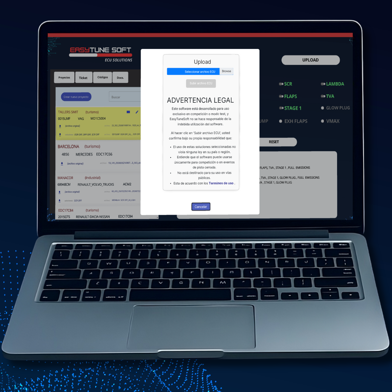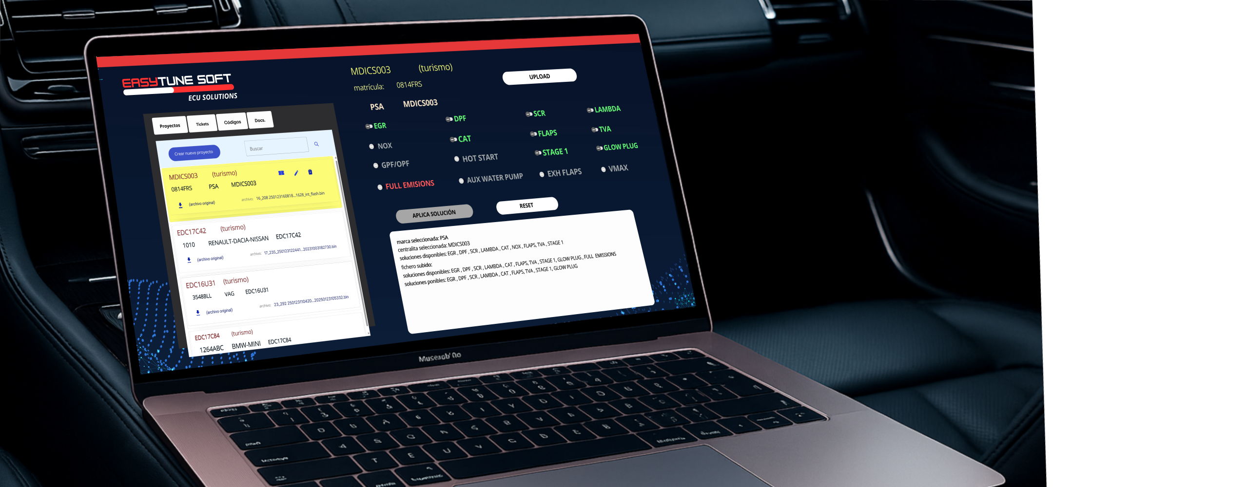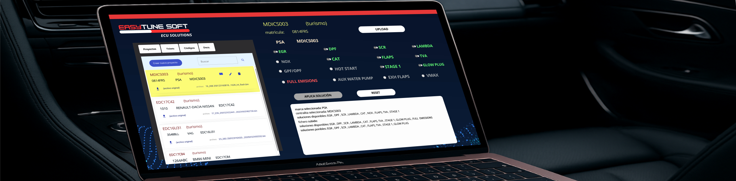 Nuestro software profesional elimina procesos manuales y errores humanos al modificar centralitas ECU. Permite ajustes como eliminación de EGR, eliminacion de DPF, eliminacion de SCR y mejoras de potencia y consumo en cuestión de segundos, con total precisión.