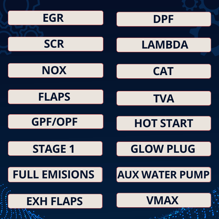 SCR, DPF, EGR, CAT, LAMBDA, FLAPS, TVA, VMAX, Stage 1, Etc.